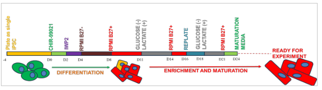 - Once CMs are contracting, i.e., from day 7 to day 11, cells are kept in RPMI supplemented with 1XB27(+insulin).